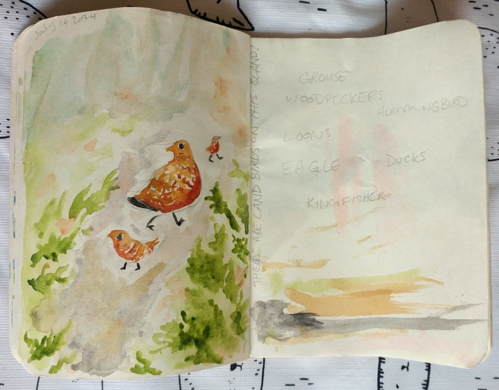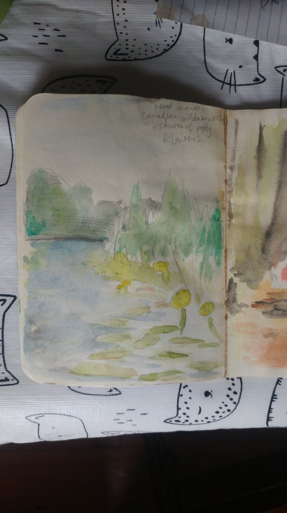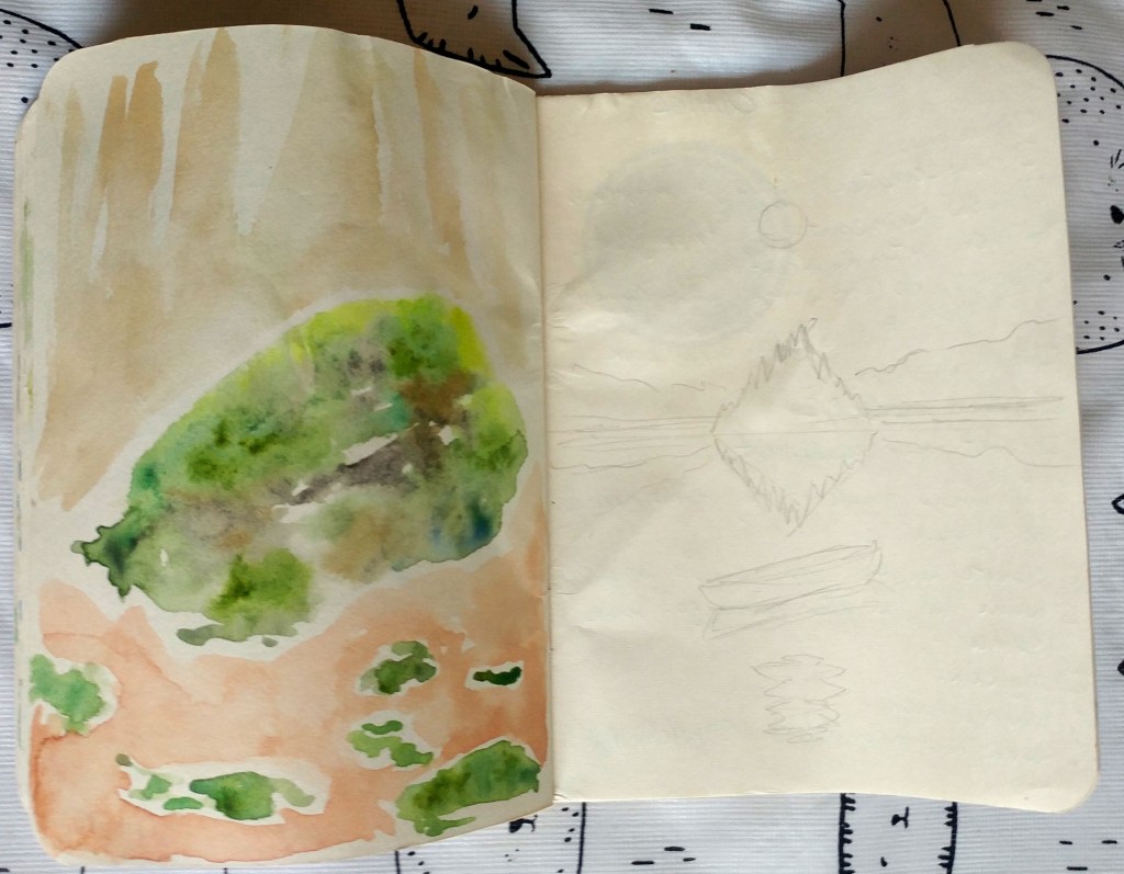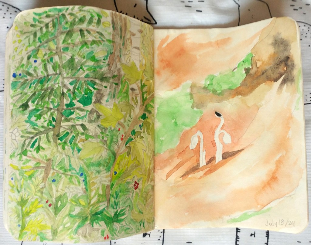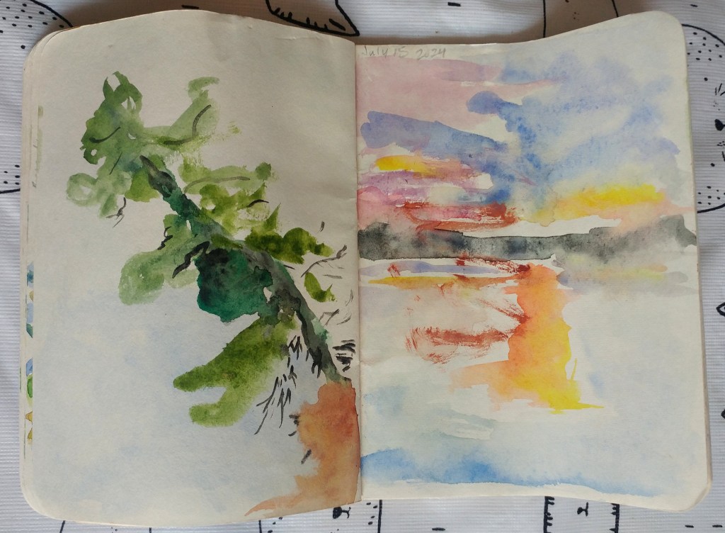 When I go camping, I like to bring a notebook and do some watercolour sketches when I have some free time. They are quick and easy to pull out, make a little piece, get a snapshot of something I’m seeing. I don’t take my phone or camera typically. I like being able to spend time with the beauty of nature, to meditate on it more than just having the image.