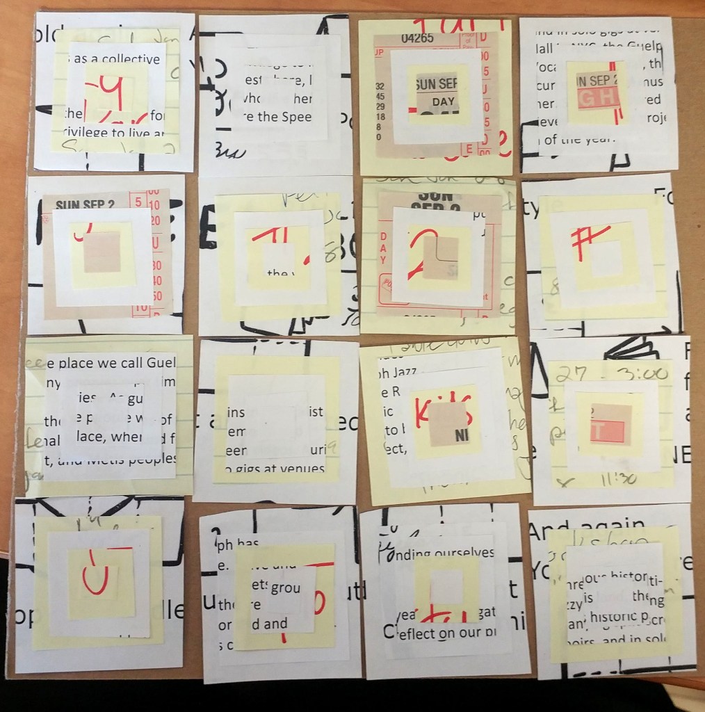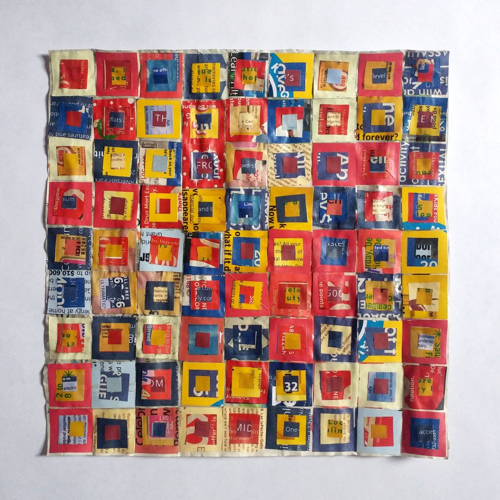 Each collage (except Missed Memo) is a nine-by-nine grid of squares. The squares are colour coded and placed according to sudokus that I have solved. I use three different sudokus per piece. The first couple had fewer rules than some I’ve made since.